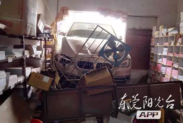 A BMW bumped into a warehouse near Dongguan People's Hospital in Guangdong province on Tuesday, local media reported. It is said that the driver mistook the gas pedal as the brake. Fortunately, no one was injured.