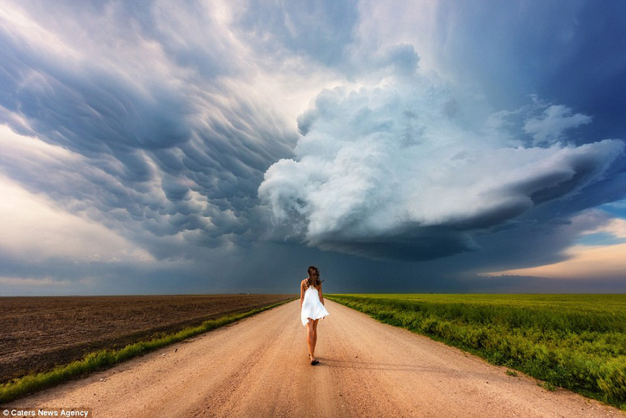 Brave model! Elisabeth Brentano fearlessly walks towards the looming storm front during a photoshoot in Dodge City, Kansas in 2015.