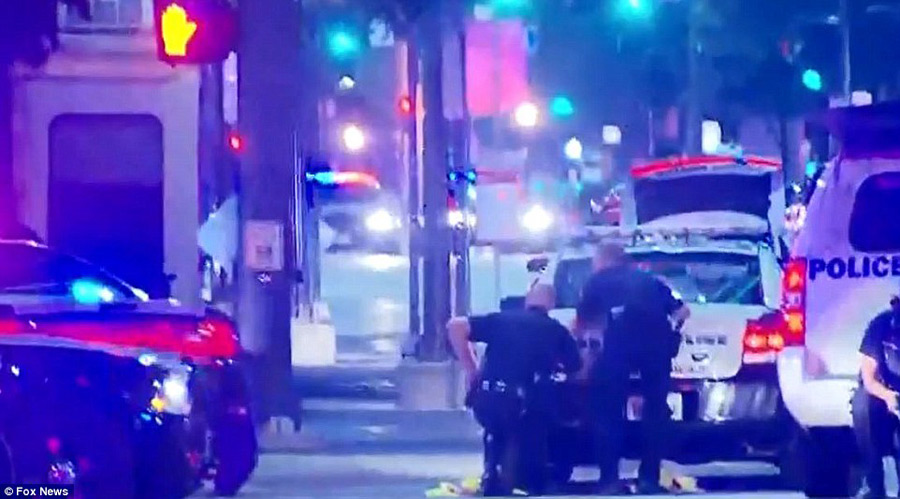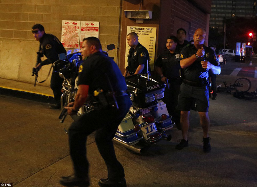 The shooting started at 8.45pm as hundreds of protesters marched through Dallas demanding justice for two black men shot dead by police earlier this week.