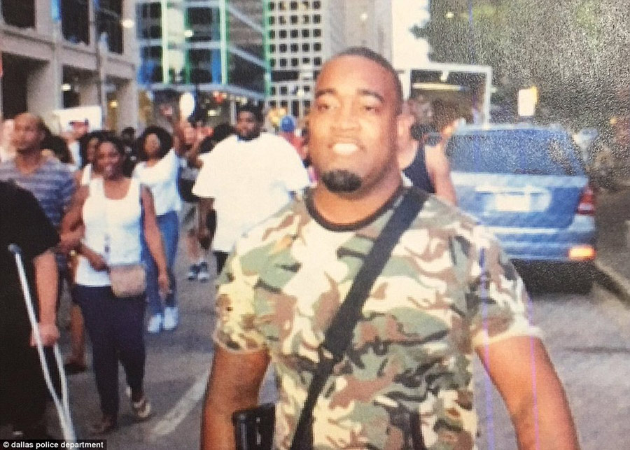 An image of Mr Hughes was released by Dallas Police showing him walk through the city carrying what appeared to be an assault rifle and wearing a camouflage shirt. The force tweeted: 'Please help us find him!'