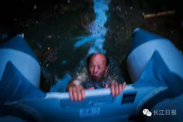 Zhang Shaoming, 67, is a security guard in the community. For the past few days, from 6 a.m. to 6 p.m., Zhang has been using a rubber boat to shuttle residents around the compound. In order to make room for more seats, as well as to oversee the safety of his passengers, Zhang himself remains in the water and pushes the boat forward with his hands. The water reaches to above his waist at all times, and sometimes even over his head in the deepest areas.