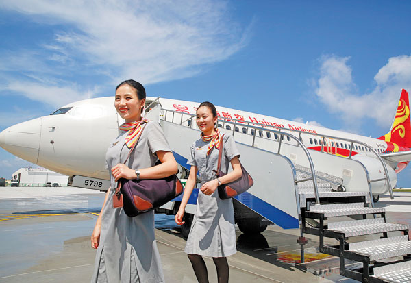 Flight attendants of Hainan Airlines arrive at Zhubi Reef in the South China Sea on Wednesday. The airplane was one of two airliners that landed for the first time on runways on Meiji Reef and Zhubi Reef.Feng Yongbin/China Daily
