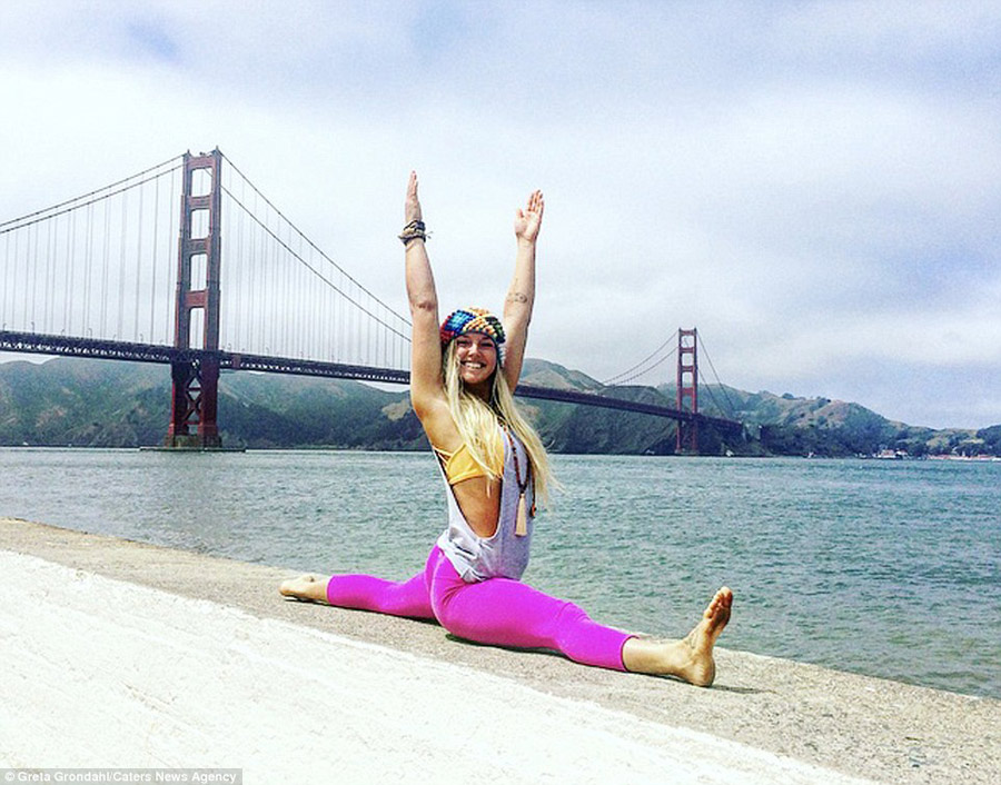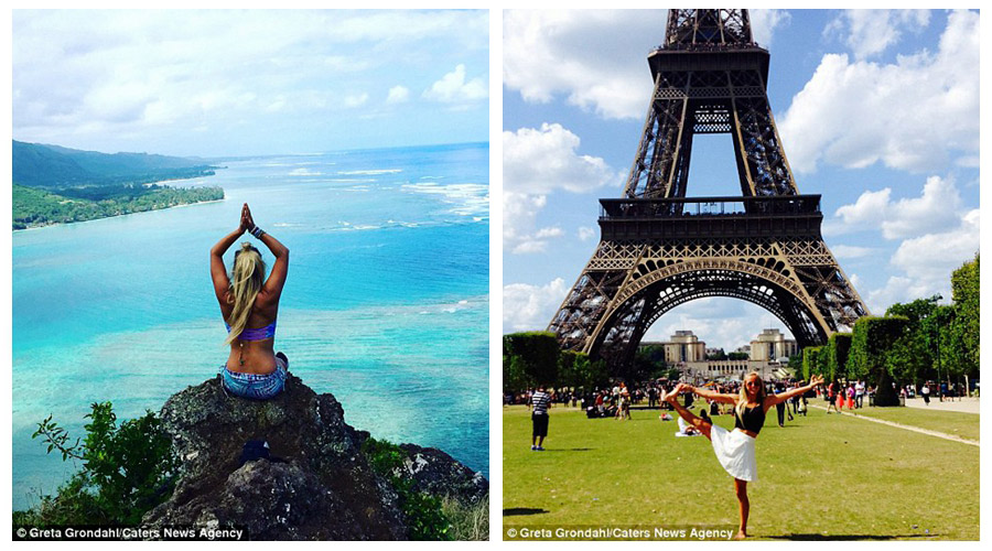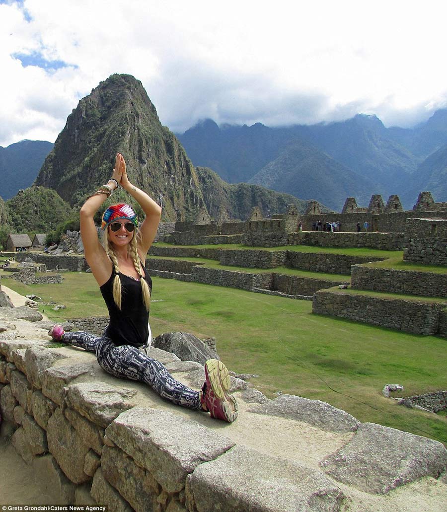 Greta Grondahl, 23, perfects her yoga poses in front of famous landmarks, including the Eiffel tower in Paris, The Golden Gate Bridge in San Francisco and ancient Machu Picchu in Peru.