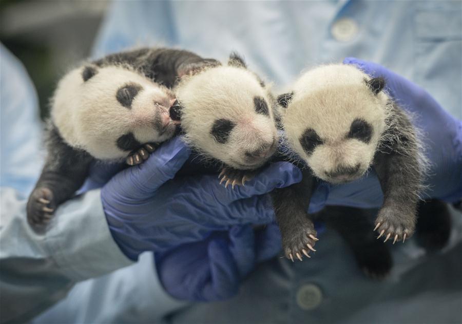 Photo taken on Aug. 28, 2014 shows giant panda triplets Mengmeng, Shuaishuai and Kuku on the 31st day after they were born in Guangzhou, capital of south China's Guangdong Province. A party celebrating the second birthday of the world's only surviving panda triplets, who were born on July 29, 2014 in Guangzhou, was held at Chimelong Safari Park here Friday. (Xinhua/Liu Dawei)