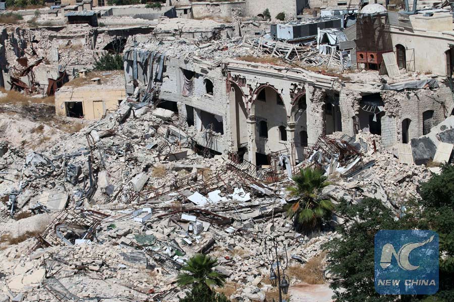 A picture taken on July 3, 2016 from the UNESCO-listed citadel shows the partially collapsed building of the famed Carlton Citadel Hotel (L), in the government-controlled side of the divided northern Syrian city of Aleppo. (AFP/Xinhua)