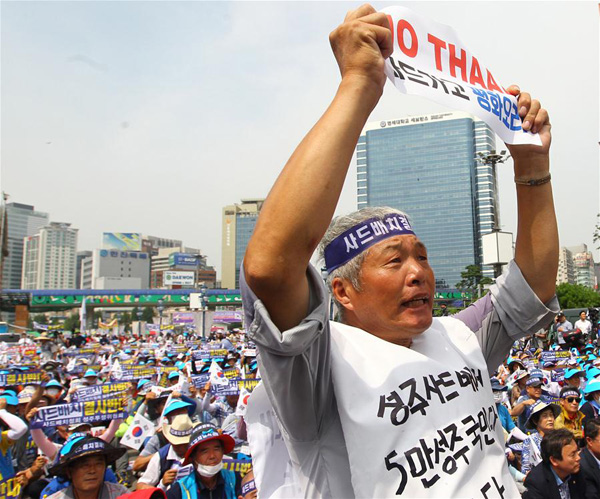 A man from Seongju county holds a banner to protest against the deployment of the Terminal High Altitude Area Defense (THAAD), during a rally in Seoul, capital of South Korea, on July 21, 2016. More than 2,000 people from Seongju county, where one THAAD battery will be deployed, gathered at a square in Seoul for a rally on Thursday, to protest against the deployment of THAAD. (Xinhua/Yao Qilin)