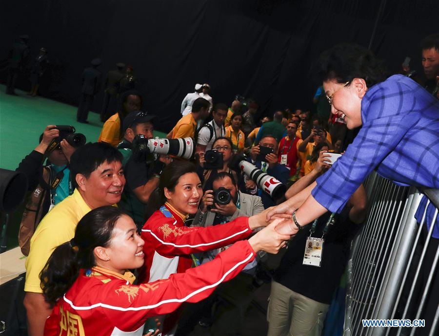 Chinese vice premier Liu Yandong (R) congratulates China's Du Li (3rd L) and Yi Siling (Front) after they won the silver and bronze medals respectively in the women's 10m air rifle shooting final at the Rio 2016 Olympic Games in Rio de Janeiro, Brazil, on August 6, 2016. (Xinhua/Han Yan)