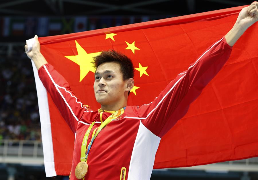 Sun Yang of China celebrates during the awarding ceremony of men's 200m freestyle swimming final at the 2016 Rio Olympic Games in Rio de Janeiro, Brazil, on Aug. 8, 2016. Sun Yang won the gold medal with 1 minute 44.65 seconds.(Xinhua/Ding Xu)