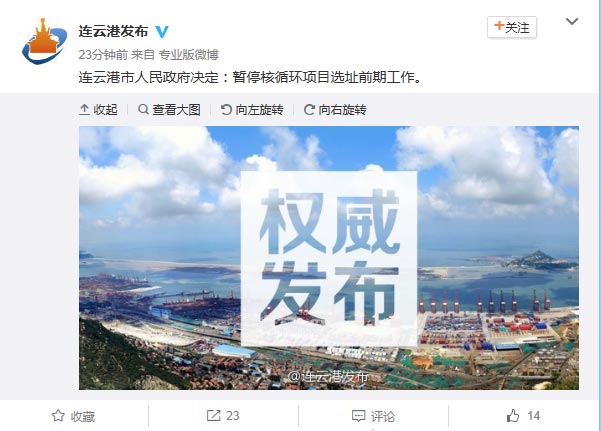 Lianyungang municipal government announced this morning on its official Weibo that the site selection of the Sino-French nuclear feul cycle project will be temporarily suspended in the city in eastern China.
