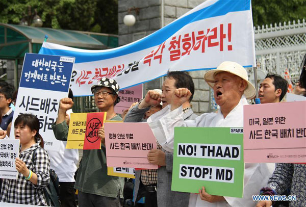 People attend a rally to protest against deploying the U.S. missile defense system, called Terminal High Altitude Area Defense (THAAD), in front of the defense ministry in Seoul, South Korea, July 13, 2016. South Korea's defense ministry on Wednesday announced an agreement with the United States to deploy the U.S. missile defense system, called Terminal High Altitude Area Defense (THAAD), to its southeastern region despite continued opposition from neighboring countries. [Photo: Xinhua/Wang Jiahui]