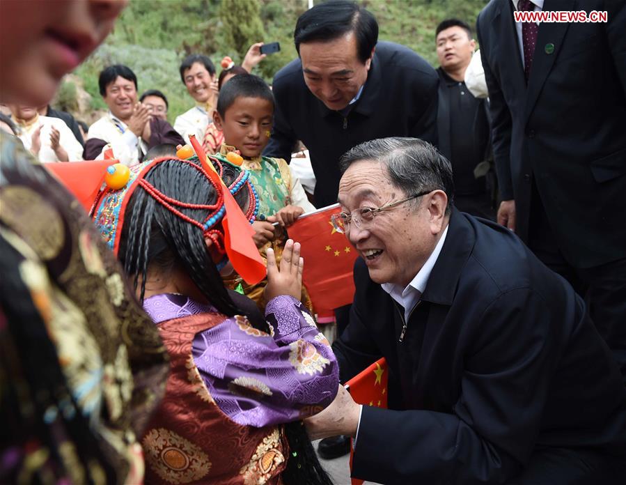 Yu Zhengsheng (R, front), chairman of the National Committee of the Chinese People's Political Consultative Conference (CPPCC), visits Darog Village of Karub District in Qamdo, southwest China's Tibet Autonomous Region, Aug. 12, 2016. Yu made an inspection tour in Qamdo from Aug. 12 to 13. (Xinhua/Zhang Duo)