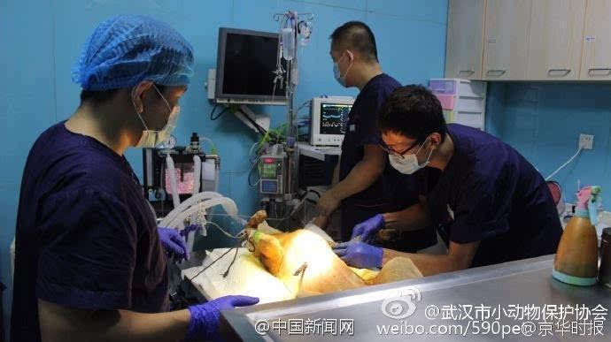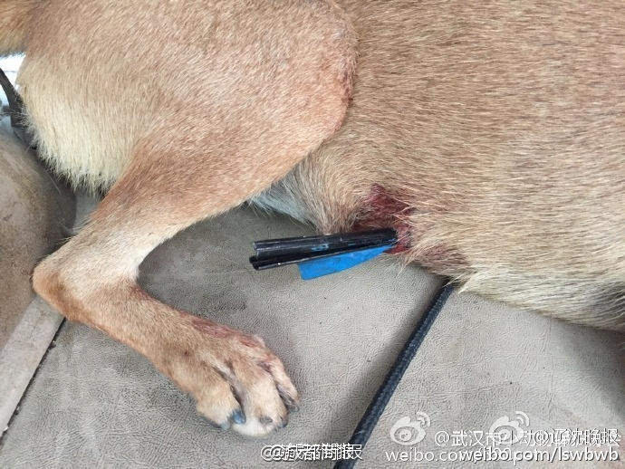 A stray dog pierced by arrow was recently spotted on the campus of Huazhong University of Science and Technology in Wuhan, Hubei province. Members of a local animal protection organization managed to catch the dog and bring it to an animal hospital. They are now looking for the person who shot the arrow.