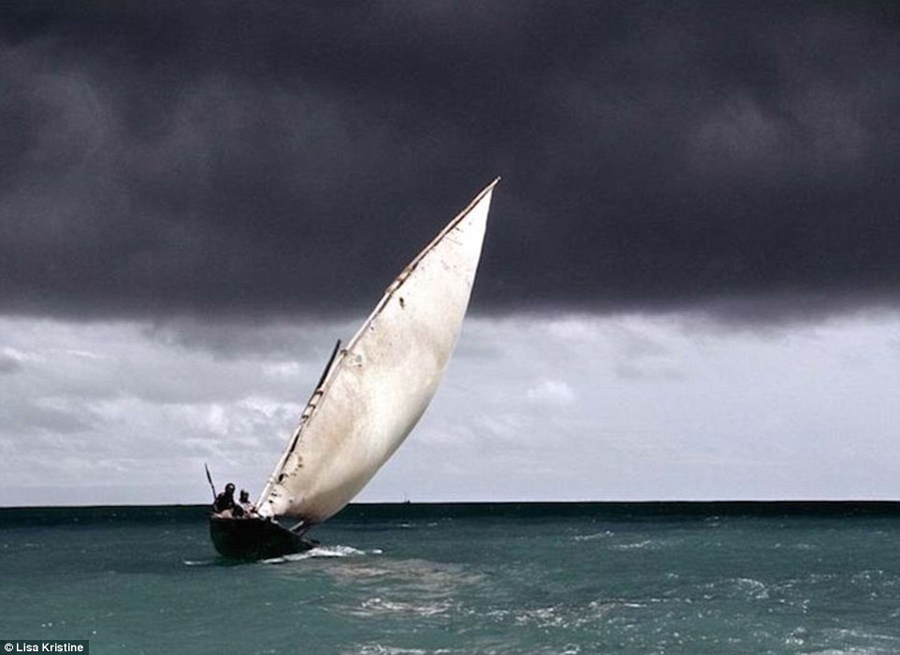 A traditional dhow boat sails near the coastline of Tanzania. Typically sporting long thin hulls, dhows mainly carry heavy items, like fruit, fresh water or merchandise.
