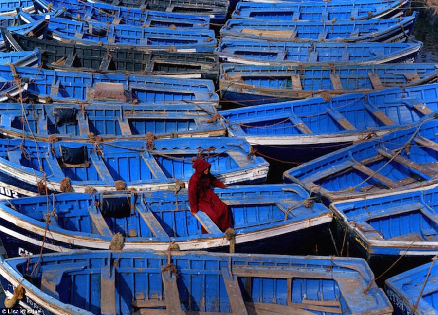 A locals in a hooded cloak and pointed slippers sits and inspect rows of boats painted in the traditional brilliant blue in the port city of Essaouira on Morocco’s Atlantic coast.