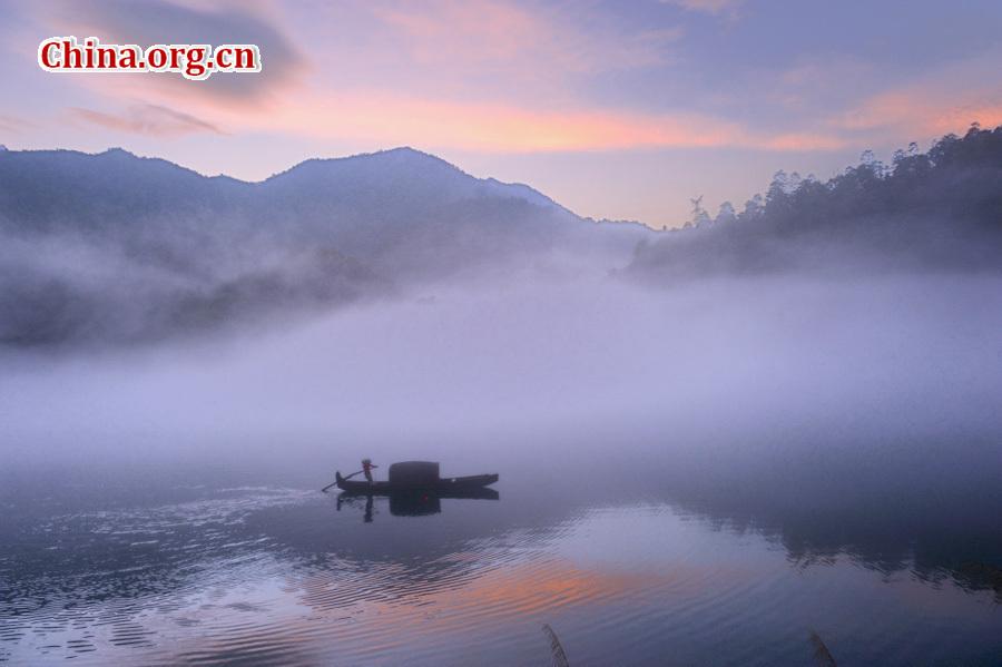 Photo shows the beautiful foggy scenery on the Xiaodongjiang River in Zixing City of central China's Hunan Province. The dreamlike foggy scenery along foggy Xiaodongjiang River from April to October every year attracts a lot of tourists and photographers.(Photo/China.org.cn)