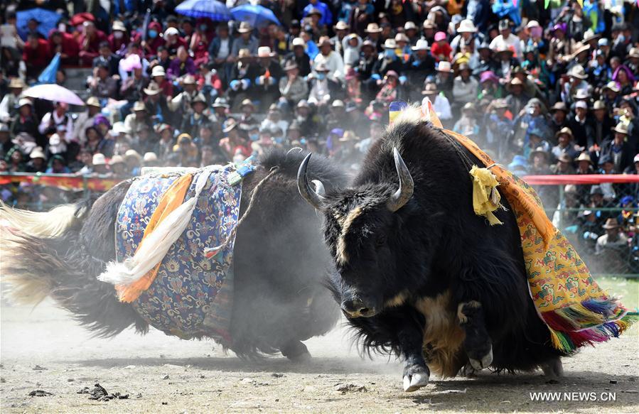 Yaks fight during a bullfighting festival in a township of Xigaze City, southwest China's Tibet Autonomous Region, Sept. 8, 2016. A bullfighting festival was held on the Damxung Grassland in Xigaze on Thursday. (Xinhua/Chogo)