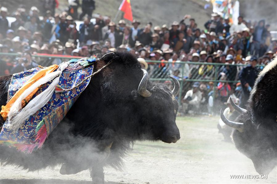Yaks fight during a bullfighting festival in a township of Xigaze City, southwest China's Tibet Autonomous Region, Sept. 8, 2016. A bullfighting festival was held on the Damxung Grassland in Xigaze on Thursday. (Xinhua/Chogo)