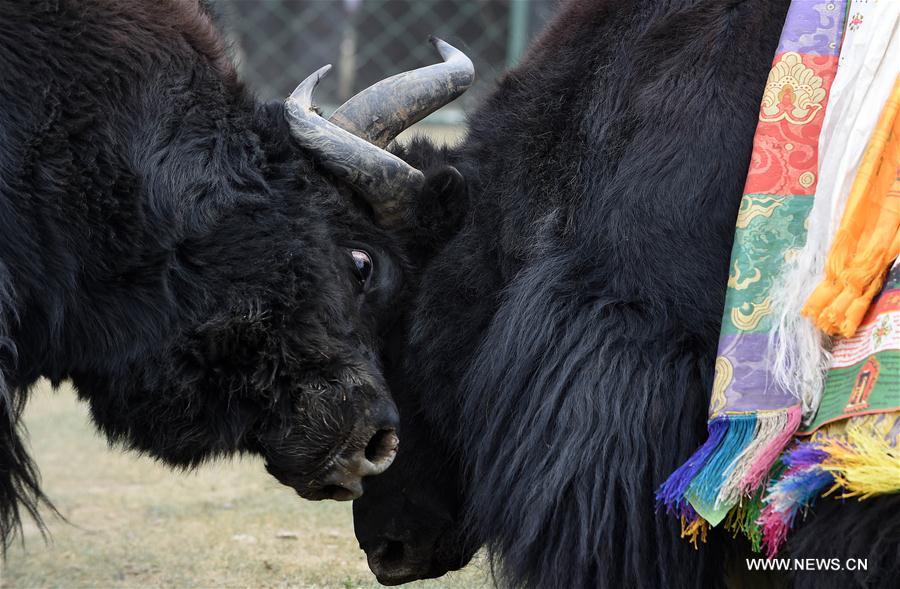 Yaks fight during a bullfighting festival in a township of Xigaze City, southwest China's Tibet Autonomous Region, Sept. 8, 2016. A bullfighting festival was held on the Damxung Grassland in Xigaze on Thursday. (Xinhua/Chogo)