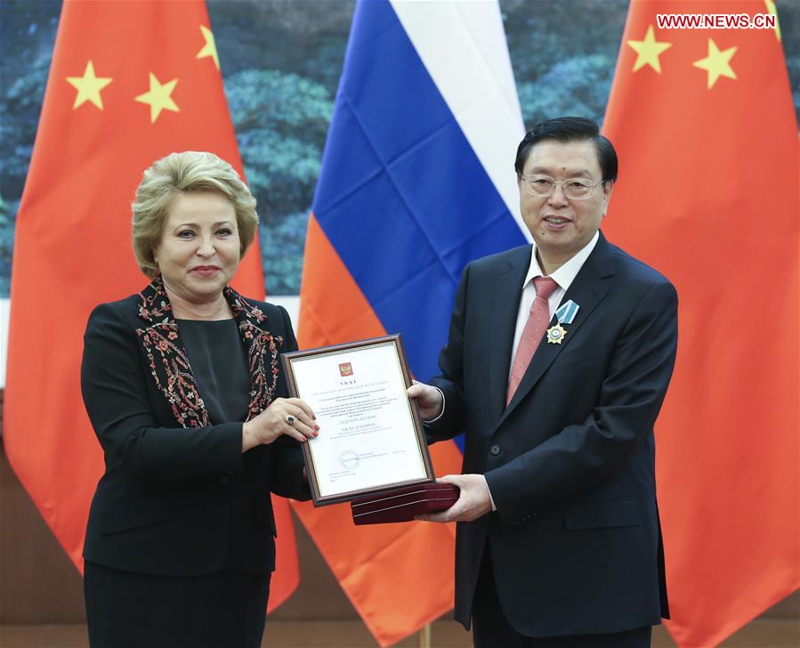 Zhang Dejiang (R), chairman of the Standing Committee of China's National People's Congress (NPC), is presented the medal "Order of Friendship" by Russian Federation Council Speaker Valentina Matviyenko on behalf of President Vladimir Putinin recognition of Zhang's contribution to China-Russia ties, after their talks in Beijing, capital of China, Sept. 9, 2016. (Xinhua/Pang Xinglei)