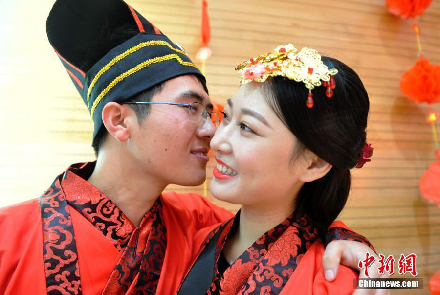 To promote green weddings and traditional Chinese culture, Shimen experimental school in Shijiazhuang, north China's Hebei province, held a collective wedding for 12 newlyweds on Teachers' Day, September 10, 2016. The couples wore the traditional Hanfu dress and consisted of at least one teacher from the school. [Photo: Chinanews.com]