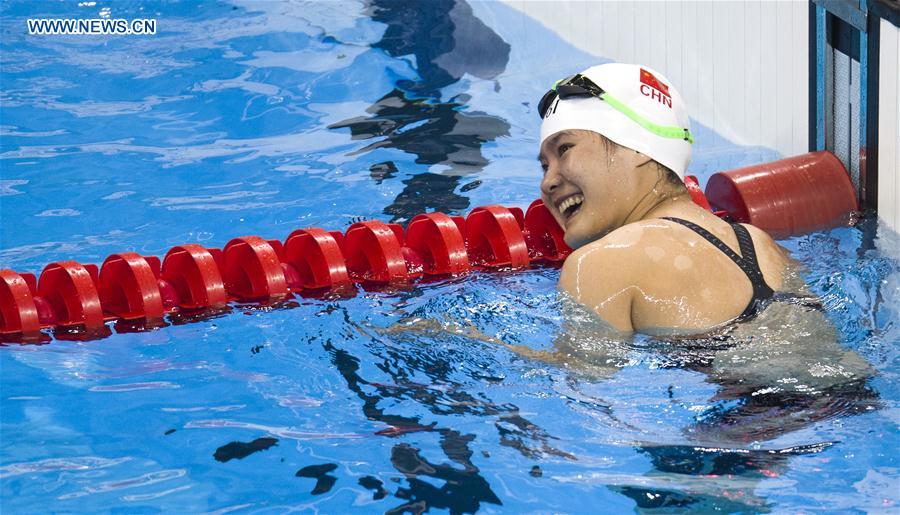 Peng Qiuping of China reacts after the women's 50m backstroke S3 at the Rio 2016 Paralympic Games in Rio de Janeiro, Brazil, Sept. 10, 2016. Peng claimed the title and broke the world record. [Photo:Xinhua]