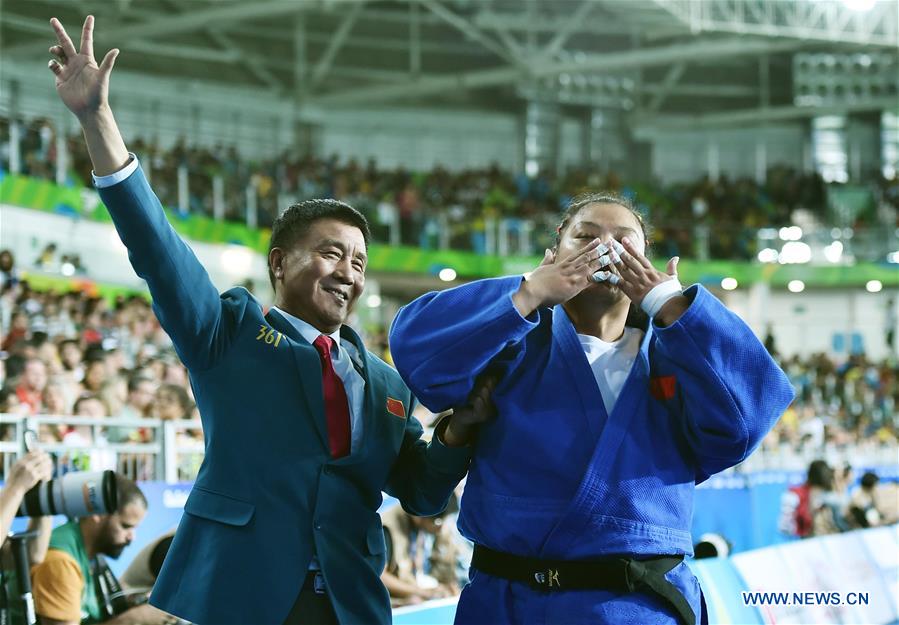 Yuan Yanping (R) of China celebrates after the Women's Judo +70KG gold medal contest of Rio 2016 Paralympic Games in Rio de Janeiro, Brazil, Sept. 10, 2016. Yuan Yanping won the gold. [Photo:Xinhua]