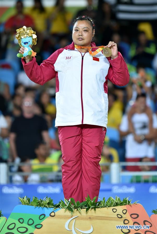 Yuan Yanping of China attends the medal presenting ceremony after the Women's Judo +70KG gold medal contest of Rio 2016 Paralympic Games in Rio de Janeiro, Brazil, Sept. 10, 2016. Yuan Yanping won the gold. [Photo:Xinhua]