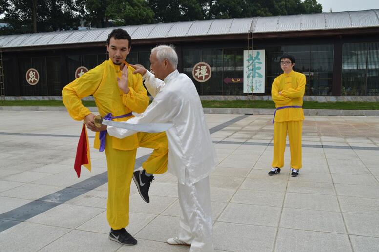 Tunisian reporter Abdallah Walid from People’s Daily Online receives training in how to strike poses for Emei knife skills. [Photo provided to people.cn]