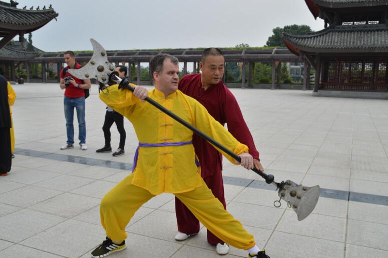 French reporter from People’s Daily Online gets a taste of how it feels to be a kungfu master. [Photo provided to people.cn]