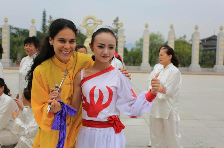 A Mexican reporter poses for a picture with her Chinese martial artsinstructor. [Photo provided to people.cn]