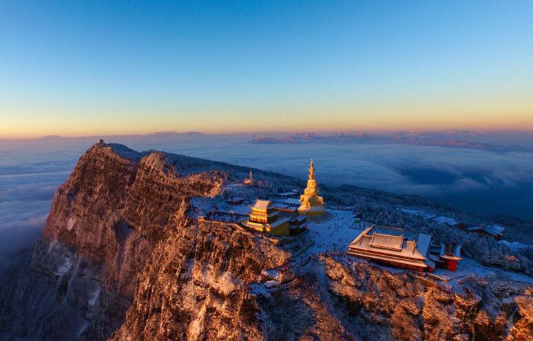 A bird’s-eye view of Mount Emei. As one of the Four Sacred Buddhist Mountains of China, the site features76 Buddhist monasteries that date back to the Ming and Qing dynasties. Most are located near the mountain top. [Photo provided to People.cn]