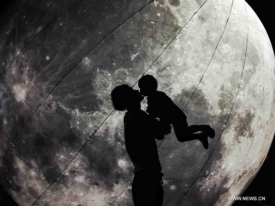 People pose for photos in front of a man-made moon in the Tianjing Lake scenic area of Tongling City, east China's Anhui Province, Sept. 12, 2016. The artificial moon with a 6-meter diameter was erected to greet the Chinese traditional Mid-Autumn Festival, which falls on Sept. 15 this year. (Xinhua/Chen Chen)