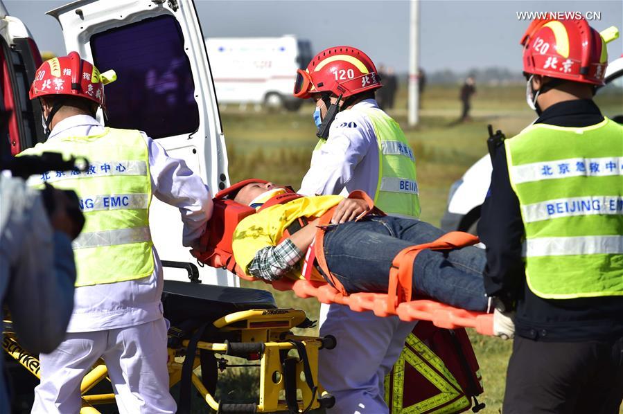 Medics carry a mock injured victim in an joint medical exercise on severe natural disasters in Zhangbei County of Zhangjiakou City, north China's Hebei Province, Sept. 13, 2016. Commissions of Health and Family Planning from Beijing City, Tianjin City and Hebei Province launched a joint medical emergency exercise on Tuesday. (Xinhua/Lian Yi)