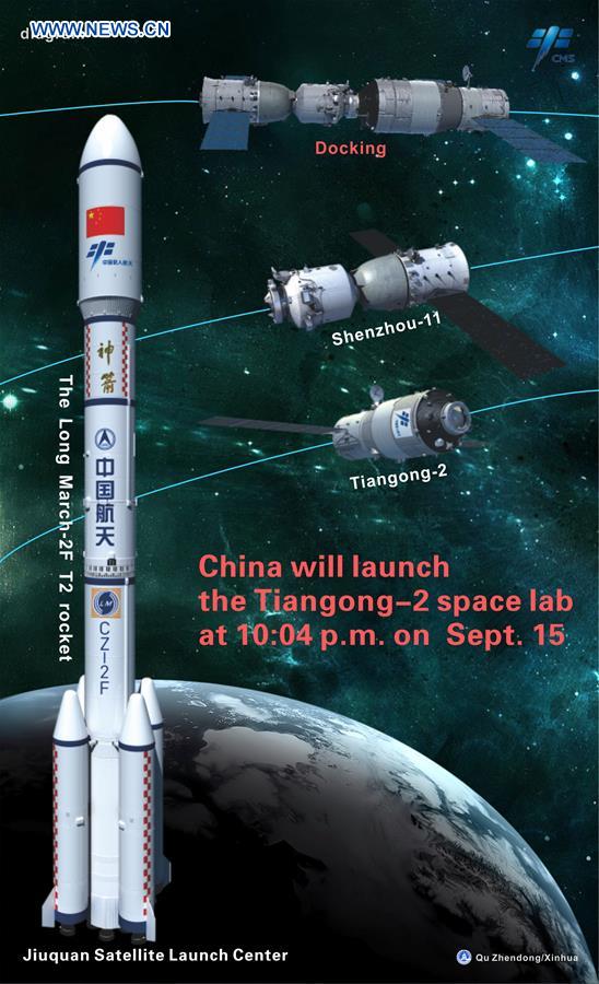 The graphics shows China will launch the Tiangong-2 space lab from the Jiuquan Satellite Launch Center in northwestern China's Gobi Desert at 10:04 p.m. on Sept. 15. (Xinhua/Qu Zhendong)