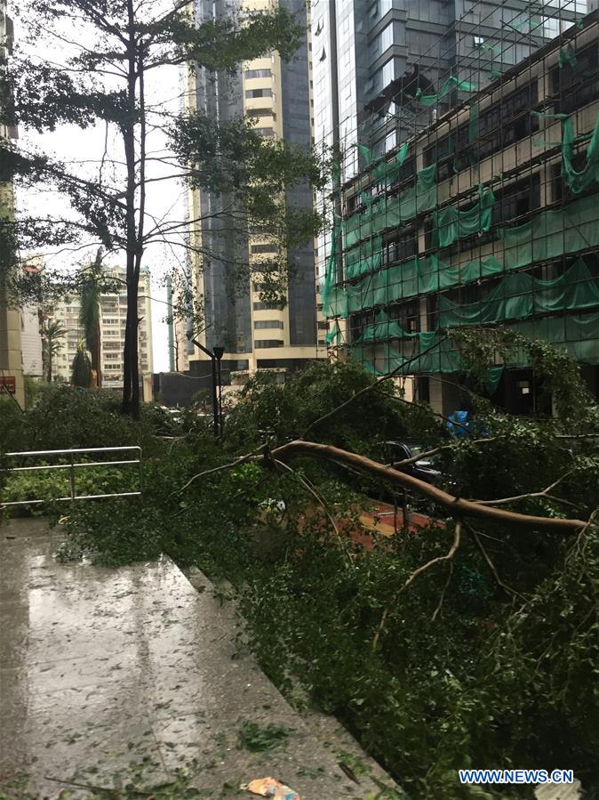 A tree is blown down by gale in typhoon-hit Xiamen City, southeast China's Fujian Province, Sept. 15, 2016. Typhoon Meranti made landfall in Xiamen in the early morning on Thursday. (Xinhua/Zheng Jun)