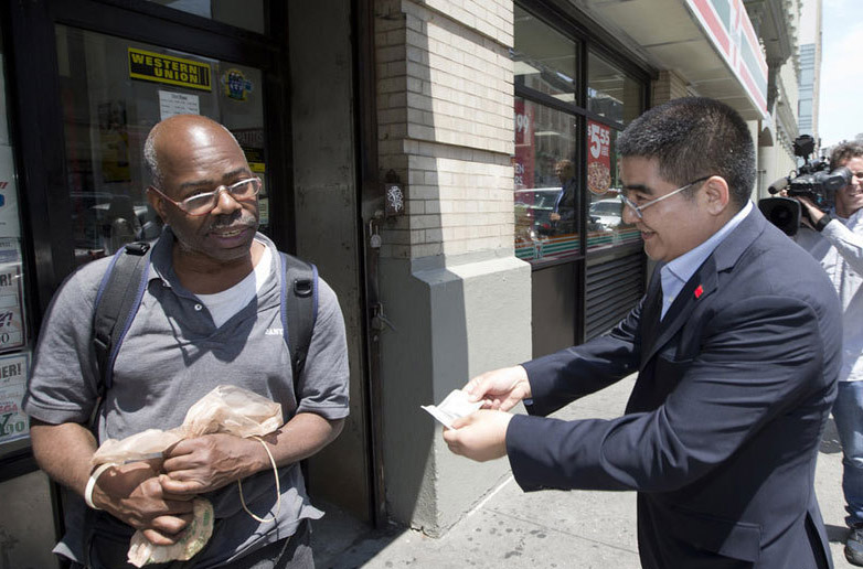 (Chen Guangbiao handed money to a man in NYC in 2014, file photo)