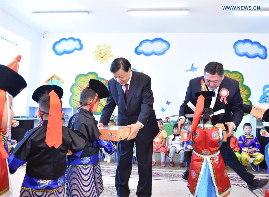 Liu Yunshan (C), a member of the Standing Committee of the Political Bureau of the Central Committee of the Communist Party of China, attends the launch ceremony of a kindergarten whose construction was funded by China Foundation for Peace and Development, in Mongolia, Oct. 2, 2016. (Xinhua/Gao Jie)