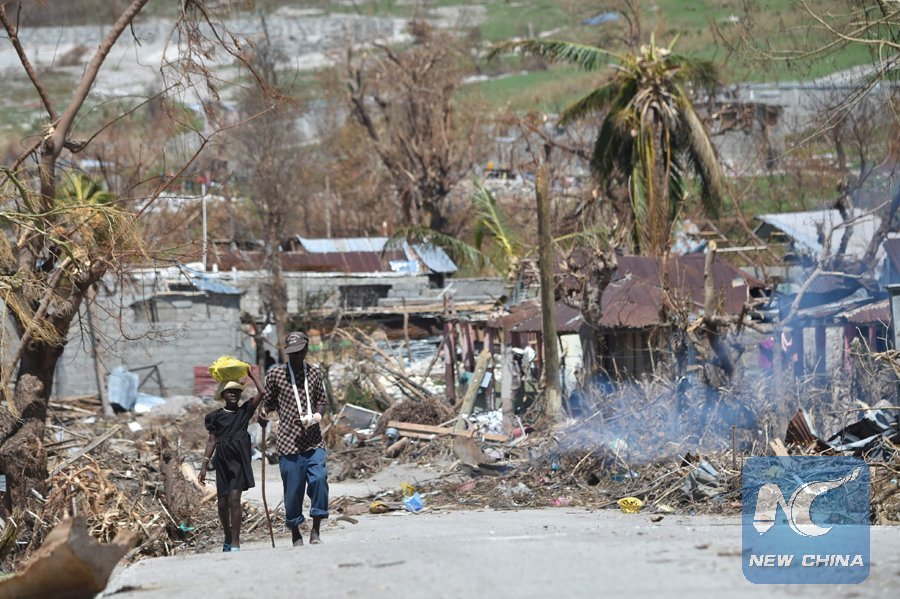 People walk down a debris covered street in the commune of Port-a-Piment, in Les Cayes, in the southwest of Haiti, on October 11, 2016. (AFP PHOTO / HECTOR RETAMAL)