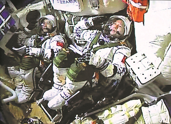 Astronauts Jing Haipeng (right) and Chen Dong salute inside the spacecraft at the moment of launching on Monday. [Photo/Xinhua]