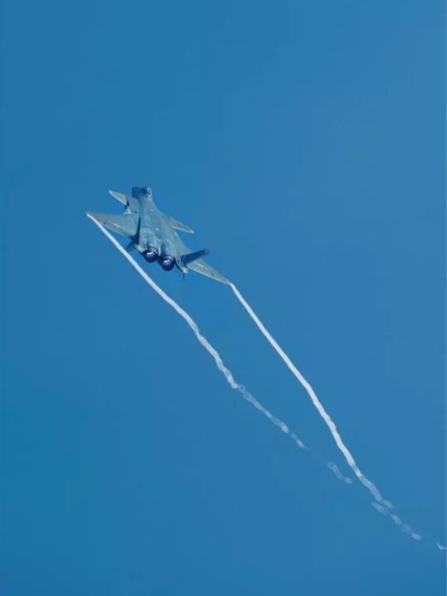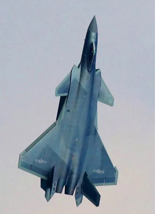 China’s 5th-generatoin J-20 fighter is seen flying with weapons bay open during a test flight recently. The configuration shown carries four radar-guided Beyond Visual Range air/air missiles. Additional weapons bays on the fuselage sides can also carry similar weapons or passive, heat-seeking AAMs.