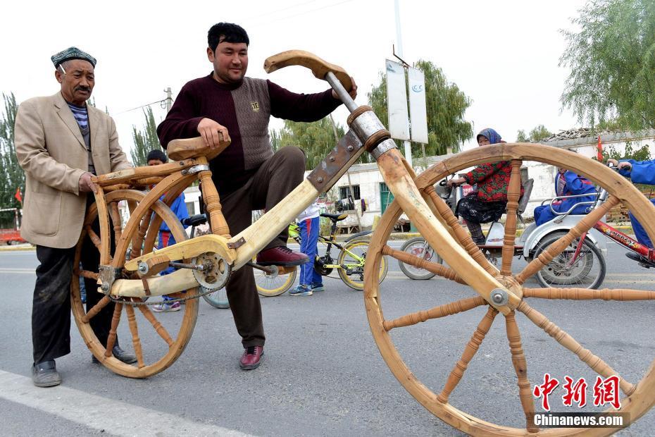 A woodworker for over 50 years, 67-year-old Mamatta Sadi from Avati County Xinjiang Uyghur Autonomous Region tested his purely hand-made wooden bicycle on the road attracting many onlookers. The bike is 2.8 meters long, 1.3 meters high, and except for a few metal pieces including more than 10 screws and bearding, the whole bicycle is made of wood. The bicycle took Sadi more than one month to complete, but he says it's not completely finished yet. He intends to add a bell, proper rubber tires and some iron pieces to strengthen the bicycle. [Photo: Chinanews.com]