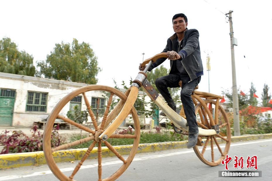 A woodworker for over 50 years, 67-year-old Mamatta Sadi from Avati County Xinjiang Uyghur Autonomous Region tested his purely hand-made wooden bicycle on the road attracting many onlookers. The bike is 2.8 meters long, 1.3 meters high, and except for a few metal pieces including more than 10 screws and bearding, the whole bicycle is made of wood. The bicycle took Sadi more than one month to complete, but he says it's not completely finished yet. He intends to add a bell, proper rubber tires and some iron pieces to strengthen the bicycle. [Photo: Chinanews.com]