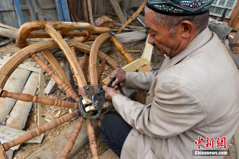 A woodworker for over 50 years, 67-year-old Mamatta Sadi from Avati County Xinjiang Uyghur Autonomous Region tested his purely hand-made wooden bicycle on the road attracting many onlookers. The bike is 2.8 meters long, 1.3 meters high, and except for a few metal pieces including more than 10 screws and bearding, the whole bicycle is made of wood. The bicycle took Sadi more than one month to complete, but he says it's not completely finished yet. He intends to add a bell, proper rubber tires and some iron pieces to strengthen the bicycle. [Photo: Chinanews.com]