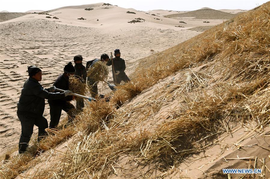 Farmers build barriers with hay to create grid patterns that stabilize sand dunes in Minqin County, Wuwei, northwest China's Gansu Province, Nov. 19, 2016. Local government planned to spend six years from 2015 to build an ecological barrier to stabilize sand and prevent desertification, which is 500km long and 1000 meters wide. (Photo/Xinhua)