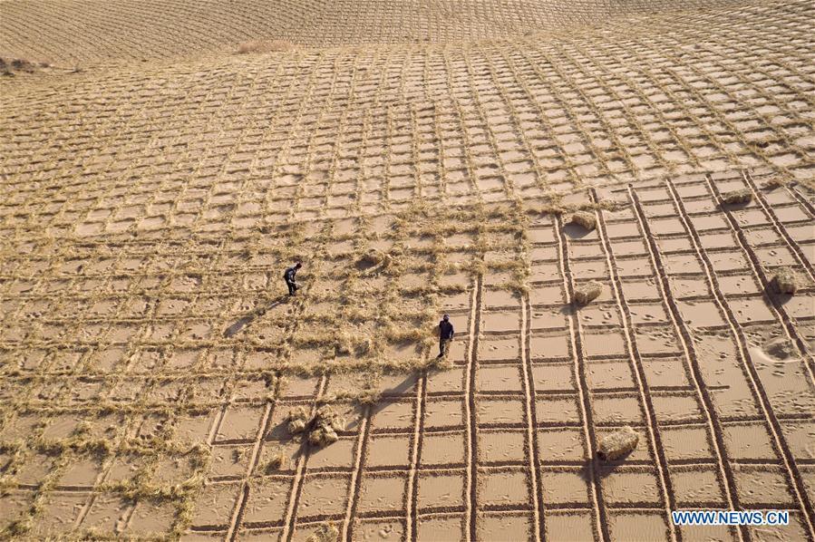 Farmers build barriers with hay to create grid patterns that stabilize sand dunes in Minqin County, Wuwei, northwest China's Gansu Province, Nov. 19, 2016. Local government planned to spend six years from 2015 to build an ecological barrier to stabilize sand and prevent desertification, which is 500km long and 1000 meters wide. (Photo/Xinhua)