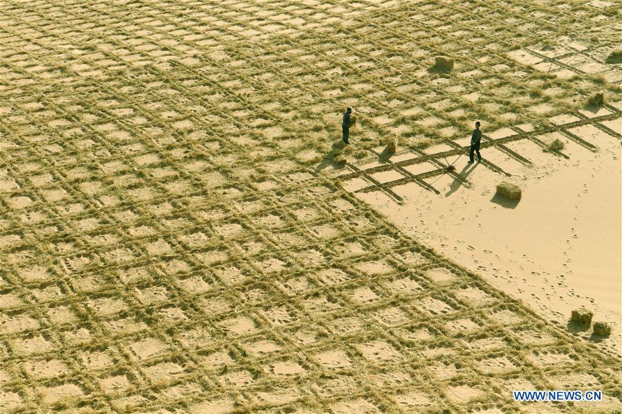 Farmers build barriers with hay to create grid patterns that stabilize sand dunes in Minqin County, Wuwei, northwest China's Gansu Province, Nov. 19, 2016. Local government planned to spend six years from 2015 to build an ecological barrier to stabilize sand and prevent desertification, which is 500km long and 1000 meters wide. (Photo/Xinhua)