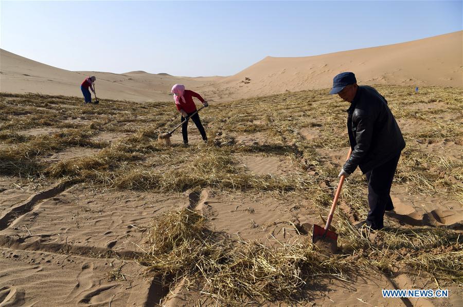 Farmers build barriers with hay to create grid patterns that stabilize sand dunes in Minqin County, Wuwei, northwest China's Gansu Province, Nov. 19, 2016. Local government planned to spend six years from 2015 to build an ecological barrier to stabilize sand and prevent desertification, which is 500km long and 1000 meters wide. (Photo/Xinhua)
