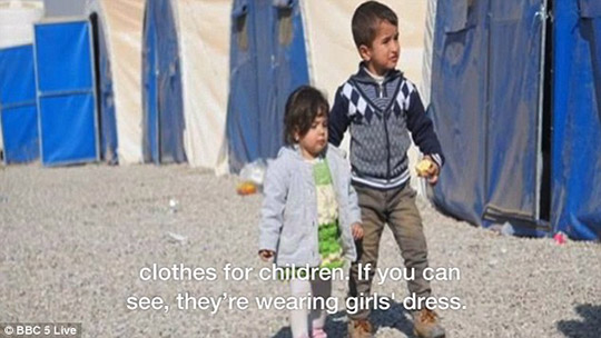 But she has complained of shortages in the camp and said: 'I've been here for four days and we have no food, we have not received clothes, as you can see they're wearing girl's dresses.'
