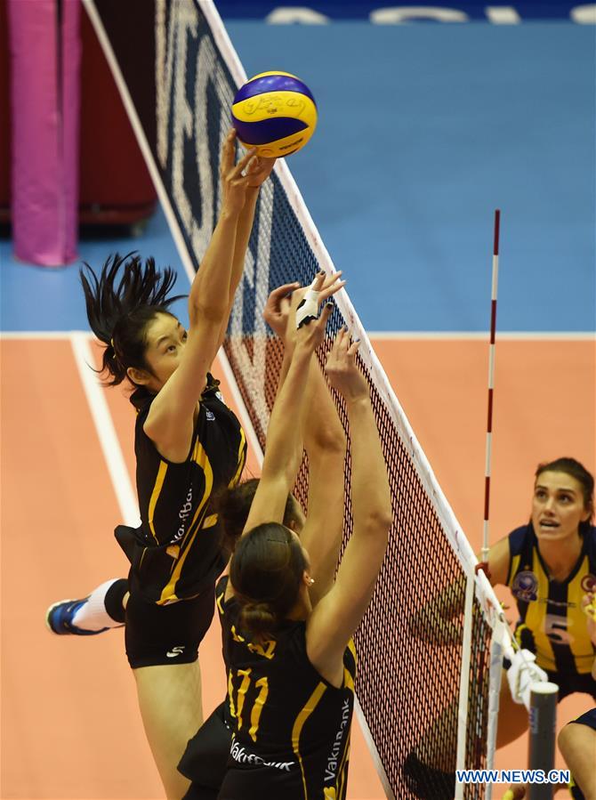 Zhu Ting (1st L) of Vakifbank competes during the Turkish Women Volleyball League match between Fenerbahce and Vakifbank in Istanbul, Turkey, on Dec. 4, 2016. Vakifbank won 3-0. (Xinhua/He Canling)