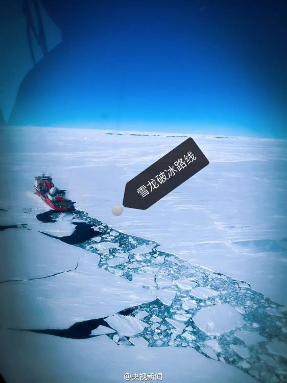 China's icebreaker Xuelong (Snow Dragon) arrives in Antarctica on December 5, 2016 after a one-month trip. The Chinese research vessel and icebreaker, which is on its 33rd Antarctic expedition, has made a stop at an ice zone nearly 31 kilometers away from Zhongshan Station. The expedition team has sent helicopters to explore the way through the ice in order to find the safest approach to Zhongshan Station. [Photo: Weibo account of CCTV News/Yang Litian]